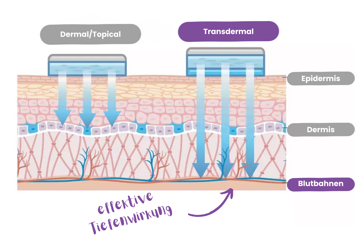 Herkömmliche Patches wirken meist nur oberflächlich (dermal/topical), maximal bis zur Epidermis. Dies ist die Oberhaut, die äusserste Hautschicht (schützt den Körper nach aussen) – das bedeutet, die Wirkstoffe bleiben überwiegend an der Hautoberfläche und dringen nicht tief genug ein, um ihre volle Wirkung zu entfalten.